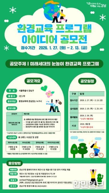 한민일보 서울포커스 박정민 기자 | 꿈이 모이는 도시, 미래를 그리는 강남구가 학교 현장에서 바로 활용할 수 있는 환경교육 콘텐츠를 발굴하기 위해 ‘2026년 강남 환경교육 프로그램 공모전’을 1월 27일부터 2월 13일까지 진행한다.