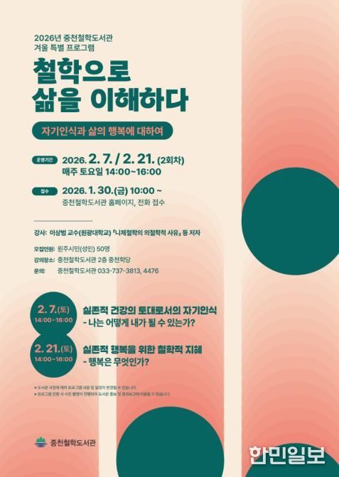 한민일보 서울포커스 임경복 기자 | 원주시 중천철학도서관은 오는 2월, 시민을 대상으로 겨울 특별 철학 프로그램 ‘철학으로 삶을 이해하다–자기인식과 삶의 행복에 대하여’를 운영한다.