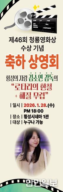 한민일보 서울포커스 진광성 기자 | 횡성문화원은 제46회 청룡영화상 청정원 단편영화상 수상자인 김소연 감독을 초청해, 오는 1월 28일(수) 오후 6시부터 횡성시네마 1관에서 ‘청룡영화상 수상 기념 축하 상영회’를 개최한다.