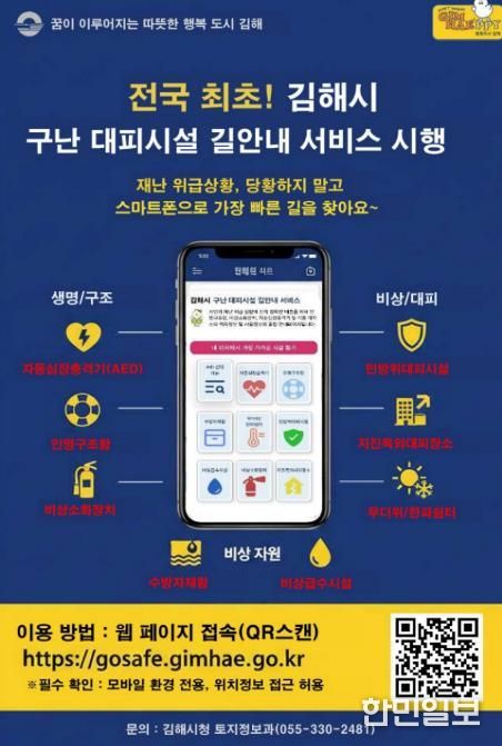 한민일보 서울포커스 김은금 기자 | 김해시는 전국 최초로 시민이 위급상황에 신속히 대응할 수 있도록 ‘구난 대피시설 길안내 웹페이지’를 자체 구축해 서비스한다고 27일 밝혔다.