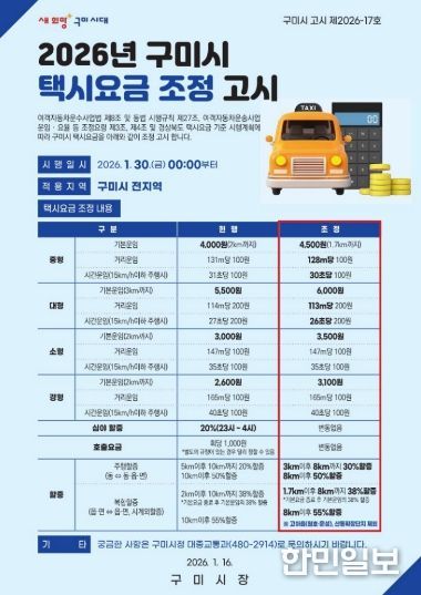 한민일보 서울포커스 김봉순 기자 | 구미시는 오는 1월 30일 00시부터 구미시 전 지역의 택시요금을 조정 시행한다.