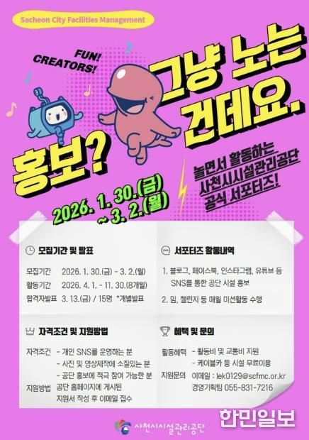 한민일보 서울포커스 김은금 기자 | 사천시시설관리공단이 1월 30일부터 3월 2일까지 2026년 SNS 서포터즈를 공개 모집한다.
