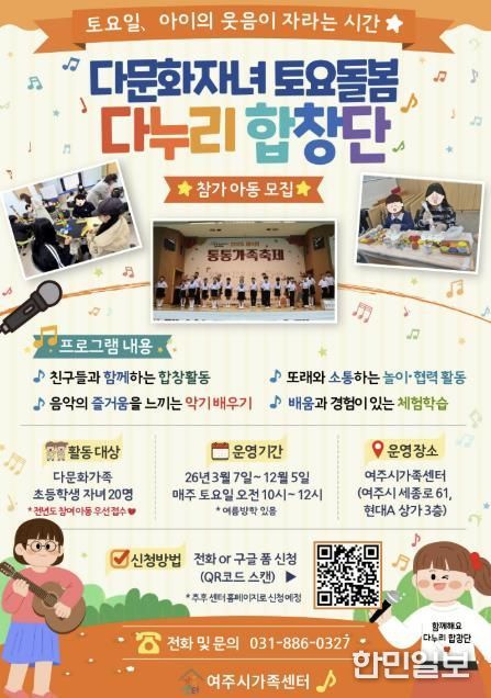 한민일보 서울포커스 전희주 기자 | 여주시가족센터는 여주시의 지원을 받아 다문화가족 자녀를 대상으로 운영한 토요돌봄 프로그램 ‘다누리 합창단’의 2025년도 운영을 성공적으로 마무리하고, 2026년도 프로그램 운영을 재개하며 참여 아동을 모집한다.
