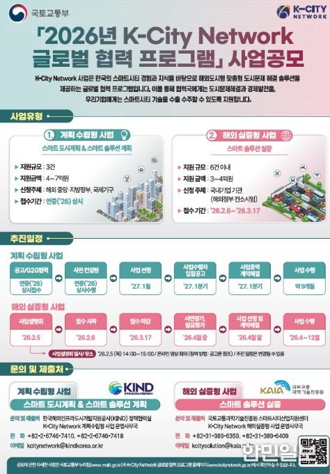 한민일보 서울포커스 임철현 기자 | 정부가 국내 스마트도시 기술의 해외 진출을 지원하기 위해 올해 'K-City 네트워크 글로벌 협력 사업' 공모를 추진한다. 이번 사업을 통해 기업들은 해외 도시에서 자사 기술을 직접 실증하고, 현지 여건에 맞는 사업 모델을 검증해 실제 수주와 사업화로 이어질 수 있는 기회를 얻게 된다.
