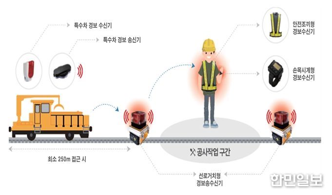 열차접근 경보장치는 특수차가 접근할 경우 작업자의 조끼·손목시계 등 4종 수신 알림장치로 즉시 경보음을 송출하는 방식으로 작동한다. 시·청각 기반 알림시스템 도입을 통해 작업자가 대피할 수 있는 ‘골든타임’을 확보할 수 있게 됐다.