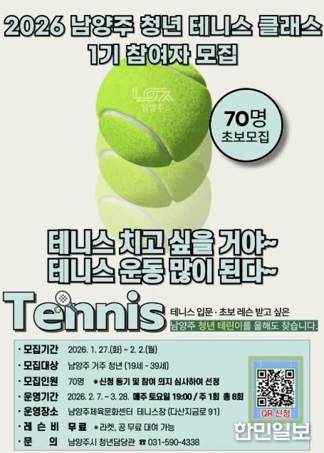 한민일보 서울포커스 김성윤 기자 | 남양주시는 27일부터 내달 2일까지 ‘2026 남양주 청년 테니스 클래스 1기’ 참여자를 모집한다고 밝혔다.