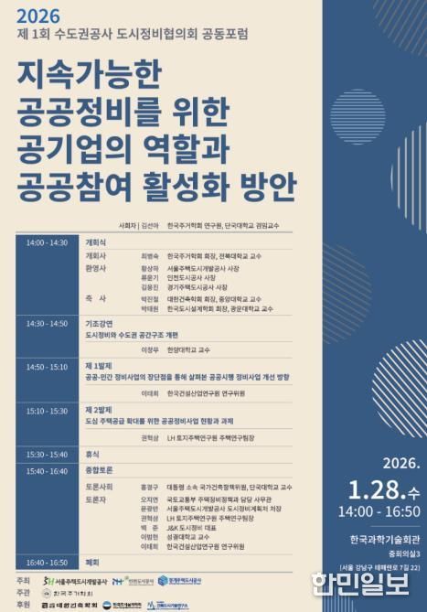 한민일보 서울포커스 김윤이 기자 | 경기주택도시공사(GH)는 1월 28일 서울 강남구 한국과학기술회관에서 서울주택도시개발공사(SH), 인천도시공사(iH)와 공동으로 ‘수도권 공사 도시정비협의회 공동포럼’을 개최한다고 27일 밝혔다.