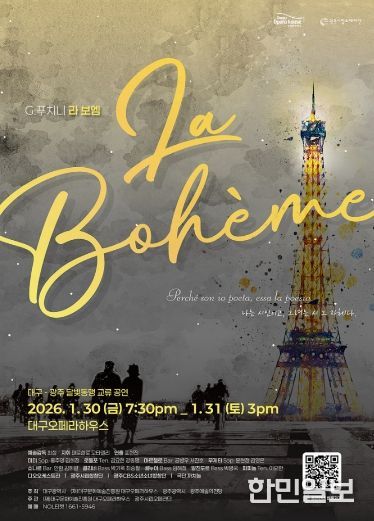 한민일보 서울포커스 김봉순 기자 | 대구문화예술진흥원 대구오페라하우스는 2026 첫 공연으로 광주시립오페라단 제작의 푸치니 오페라 '라 보엠'을 1월 30일 오후 7시 30분, 31일 오후 3시에 대구오페라하우스에서 선보인다.