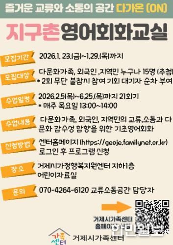 지구촌 영어회화교실 신청은 거제시가족센터 홈페이지를 통해 1월 29일까지 가능하며 관내 다문화가족, 외국인, 지역민이면 누구나 참여할 수 있다.