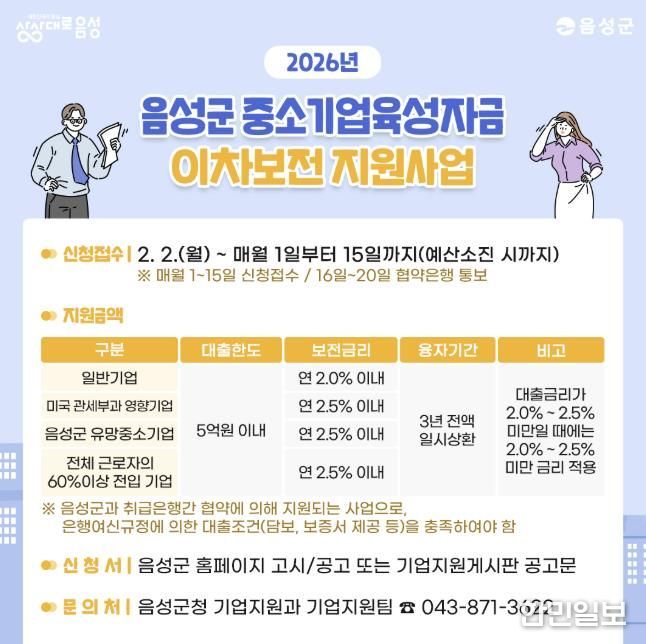 한민일보 서울포커스 김다남 기자 | 음성군은 저금리 정책자금 지원을 통해 관내 중소기업의 유동성 확보를 도모하고, 고금리 장기화에 따른 기업의 금융비용 부담을 완화하기 위해 2026년 음성군 중소기업육성자금 이차보전 지원사업을 오는 2월부터 본격 추진한다.