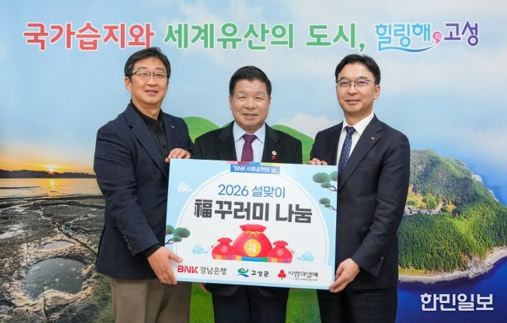 한민일보 서울포커스 김은금 기자 | 고성군은 임재문 BNK경남은행 서부영업그룹부행장이 1월 26일 고성군청을 방문하여 관내 어려운 이웃을 위해 써 달라며 450만 원 상당의 ‘설날맞이 복꾸러미’(식료품세트 18종) 100박스를 전달했다고 밝혔다.