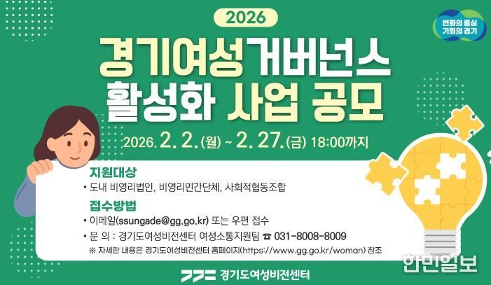 한민일보 서울포커스 김윤이 기자 | 경기도여성비전센터가 오는 2월 27일까지 경기여성거버넌스 활성화 공모사업 수행 단체를 모집한다.