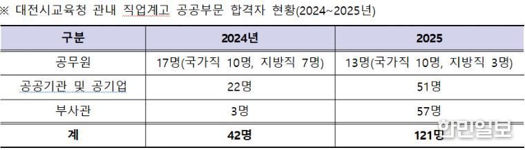 한민일보 서울포커스 유한희 기자 | 대전시교육청은 2025년 관내 직업계고 학생들의 공무원, 공공기관 및 공기업, 군부사관 합격 현황을 분석한 결과, 총 121명이 합격하며 전년 대비 비약적인 성장을 기록했다고 밝혔다.