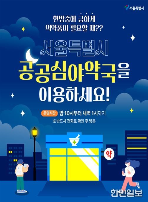서울시는 늦은 밤 갑작스러운 증상으로 어려움을 겪는 시민을 위해 밤 10시부터 다음 날 새벽 1시까지 운영하는 공공심야약국을 25개 자치구, 총 39개소를 운영하고 있다. 이 중 365일 운영되는 약국은 28곳, 요일별로 운영되는 약국은 11곳이다. 요일별 운영은 월‧수‧금 등 특정 요일을 지정해서 운영하는 방식이다.