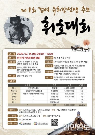 한민일보 서울포커스 김용택 기자 | 인천서구문화재단은 오는 2월 2일부터 2월 27일까지 ‘제1회 검여 유희강 선생 추모 휘호대회’ 참가자를 모집한다.