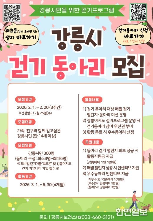 한민일보 서울포커스 임경복 기자 | 강릉시보건소는 시민들의 건강 걷기 참여를 확대하고 걷기 생활화를 정착시키기 위해 ‘2026 행복 가득, 건강 가득’ 강릉시 걷기 동아리 참가자를 오는 2월 1일부터 2월 20일까지 모집한다.