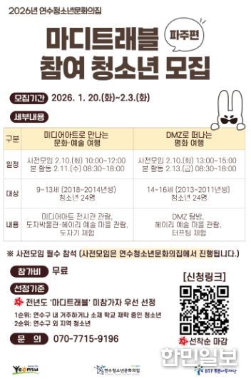 한민일보 서울포커스 백진욱 기자 | 연수청소년문화의집은 겨울방학을 맞아 청소년들의 알찬 방학 생활과 문화·예술적 소양 함양을 돕기 위해 ‘겨울방학 프로그램’을 운영한다.