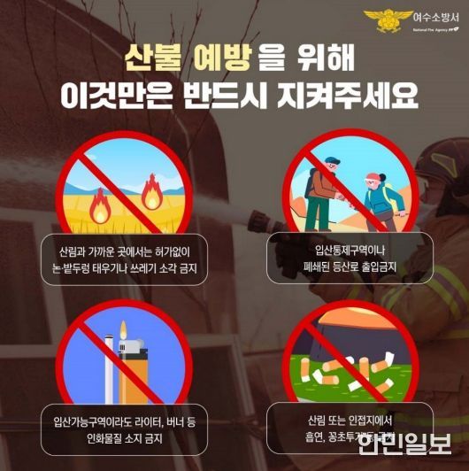 여수소방서는 산불 예방을 위해 시민들에게 다음과 같은 사항을 반드시 지켜줄 것을 당부했다. 주요 내용은 ▲산림과 인접한 지역에서 허가 없는 논·밭두렁 태우기 및 쓰레기 소각 금지 ▲입산통제구역 및 폐쇄된 등산로 출입 금지 ▲입산 가능 구역이라도 라이터, 버너 등 인화물질 소지 금지 ▲산림 또는 인접 지역에서 흡연 및 담배꽁초 투기 금지 등이다.