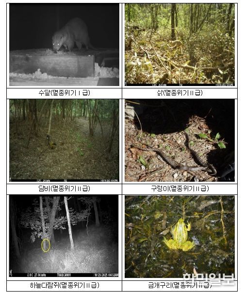조사 결과, 확인된 멸종위기 야생생물 9종은 Ⅰ급 수달을 비롯해 Ⅱ급 8종(삵, 담비, 구렁이, 하늘다람쥐, 금개구리, 표범장지뱀, 참매, 새매)이다.