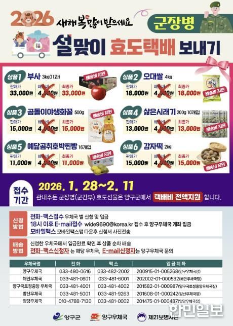 지원 기간은 2월 11일까지며, 부대 내 군사우체국을 포함한 양구군의 모든 우체국에서 전화·팩스·이메일 등의 방법으로 신청하면 된다.
