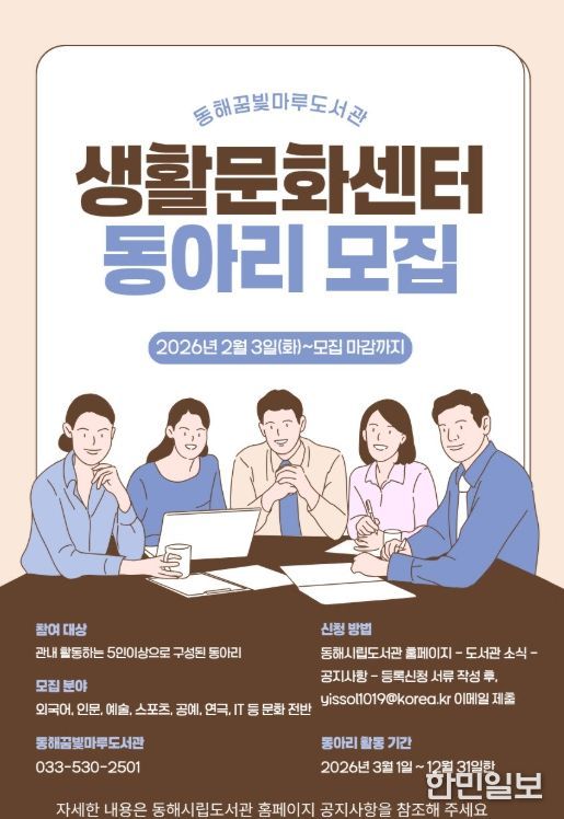 한민일보 서울포커스 임경복 기자 | 동해시는 시민들이 동아리(소모임) 활동을 통해 취미와 취향을 발견하고, 지역사회 전반에 자발적인 생활문화가 확산될 수 있도록 '2026년도 꿈빛마루 생활문화센터 동아리 모집'을 시행한다고 밝혔다.