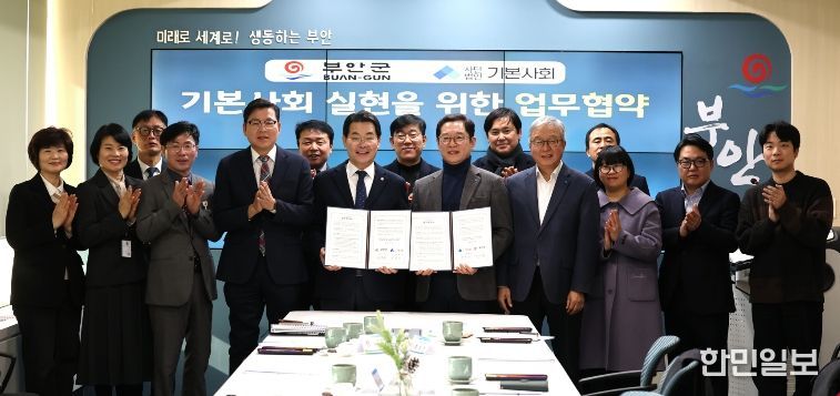 한민일보 서울포커스 김용택 기자 | 부안군은 2일 군청 중회의실에서 사단법인 기본사회와 ‘기본사회 실현을 위한 업무협약(MOU)’을 체결하고, 지역 실정에 맞는 기본사회 정책 발굴과 실행을 위한 전략적 협력체계를 구축했다.
