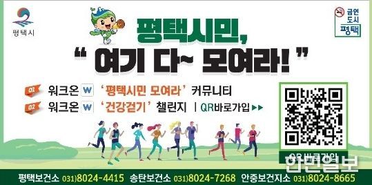 한민일보 서울포커스 황준형 기자 | 평택시는 시민들의 건강증진을 위해 스마트폰 하나로 누구나 쉽게 참여할 수 있는 모바일 건강 커뮤니티 ‘평택시민 모여라(워크온)’을 활발히 운영 중이라고 밝혔다.