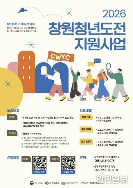 한민일보 서울포커스 김서윤 기자 | 창원특례시는 장기간 취업 준비로 지친 청년들의 구직 의욕을 높이고 성공적인 사회 진입을 돕기 위해 ‘2026년 청년도전지원사업’ 참여자를 모집한다고 밝혔다.