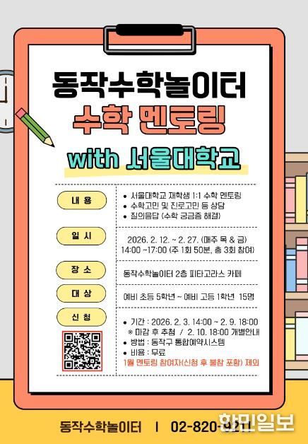 한민일보 서울포커스 곽중희 기자 | 동작구가 동작수학놀이터에서 진행하는 ▲서울대생 1:1 수학 멘토링과 ▲수능수학 완전정복 프로그램 참여자를 모집한다고 밝혔다.
