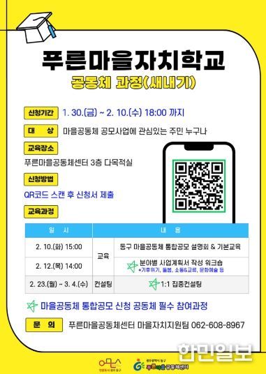 한민일보 서울포커스 임경복 기자 | 광주 동구는 마을공동체 활동에 관심 있는 주민을 대상으로 ‘푸른마을자치학교 공동체 과정(새내기)’을 이달 10일부터 오는 3월 4일까지 운영한다고 밝혔다.