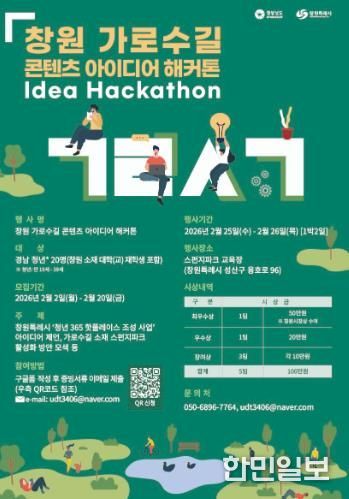 한민일보 서울포커스 김서윤 기자 | 창원특례시는 ‘청년 365 핫플레이스 조성 사업’의 일환으로 2026년 2월 25일부터 26일까지 이틀간 스펀지파크 교육장(창원시 성산구 용호로 96)에서 '창원 가로수길 콘텐츠 아이디어 해커톤' 을 개최한다고 밝혔다.