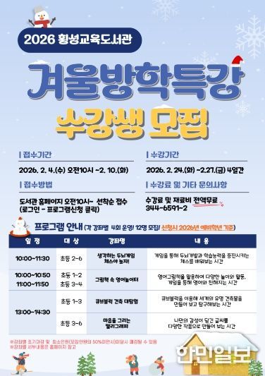한민일보 서울포커스 진광성 기자 | 횡성교육도서관(관장 권정애)은 2월 4일부터 2월 10일까지 관내 초등학생을 대상으로 겨울방학 특강 수강생을 모집한다.