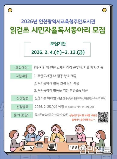 한민일보 서울포커스 유창렬 기자 | 인천광역시교육청주안도서관은 지역주민의 자발적 독서문화 확산을 위하여 2월 4일부터‘2026년 읽걷쓰 시민자율독서동아리’를 모집한다.