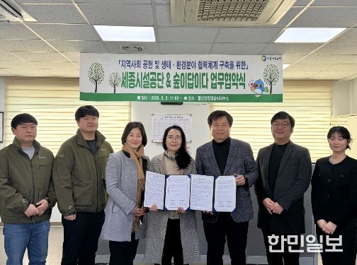 한민일보 서울포커스 진광성 기자 | 세종특별자치시시설관리공단은 3일, 합강캠핑장에서 산림복지서비스 전문기관 ㈜숲이답이다(대표 강경희)와 지역사회 공헌 및 생태·환경 분야 협력체계 구축을 위한 업무협약을 체결했다고 밝혔다.