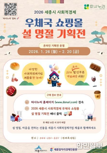 한민일보 서울포커스 김윤이 기자 | 세종일자리경제진흥원이 설 명절을 맞아 세종시 사회적경제기업의 온라인 판로 확대와 매출 증대를 위해 ‘2026년 세종시 사회적경제 우체국쇼핑몰 온라인 설 기획전’을 운영한다고 밝혔다.