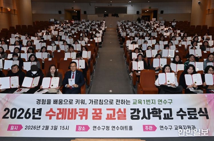 한민일보 서울포커스 백진욱 기자 | 연수구는 지난 3일 구청 연수아트홀에서 ‘2026년 수레바퀴 꿈 교실 강사학교’ 수료식을 성황리에 개최했다.