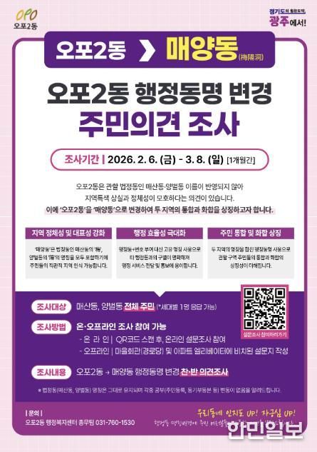 한민일보 서울포커스 임경복 기자 | 광주시 오포2동은 지역 정체성을 반영한 행정동 명칭 변경을 위해 2월 6일부터 3월 8일까지 오포2동 전 세대를 대상으로 주민 의견 조사를 실시한다고 4일 밝혔다.