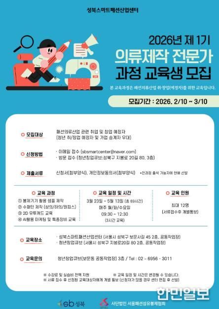 한민일보 서울포커스 김봉순 기자 | 서울 성북구가 (사)서울패션섬유봉제협회에 위탁 운영 중인 성북스마트패션산업센터에서 2026년 제1기 의류제작 전문가과정 교육생을 모집한다.