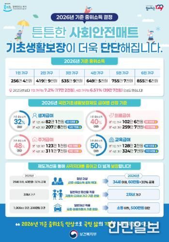 2026년 기준중위소득(국민 가구소득의 중간값으로 복지사업을 선정하는 기준)은 4인 가구 기준 649만 4천738원으로 지난해보다 6.51% 인상됐다.