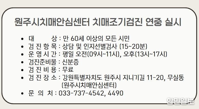 한민일보 서울포커스 임경복 기자 | 원주시치매안심센터는 치매 조기 발견과 적기 치료를 위해 지역 내 60세 이상 주민을 대상으로 치매 조기 검진 사업을 연중 실시하고 있다.