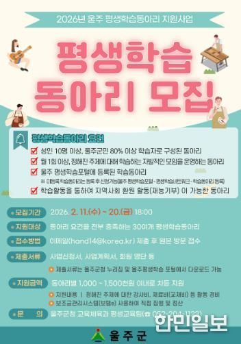 한민일보 서울포커스 기자 | 울산 울주군이 오는 11일부터 20일까지 ‘2026년 우수 평생학습동아리 지원사업’ 참여 동아리를 모집한다고 5일 밝혔다.