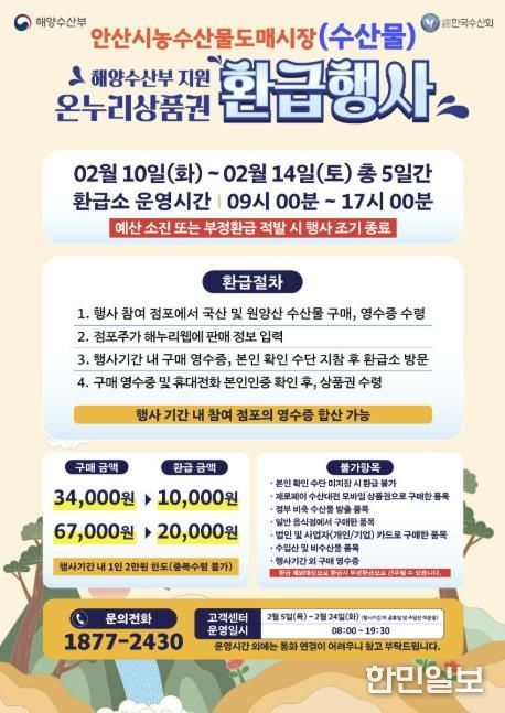 한민일보 서울포커스 임철현 기자 | 안산시는 설 명절을 맞아 국산 수산물 소비 촉진과 도매시장 활성화를 위해 오는 10일부터 14일까지 5일간 ‘2026년 설 온누리상품권 환급행사’를 개최한다고 5일 밝혔다.