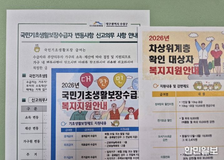 한민일보 서울포커스 임경복 기자 | 대구 수성구는 2026년 기초생활보장제도 개선 및 기준 완화에 발맞춰 복지사각지대를 해소하고 주민 체감도를 높이기 위한 맞춤형 복지사업을 본격 추진한다고 밝혔다.