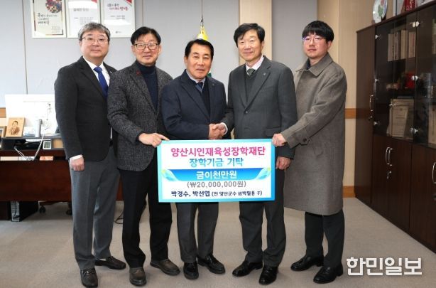 양산시 인재육성장학재단은 지난 5일 박경수((주)양산위생공사 대표)씨와 박선엽(대진기업(주) 대표)씨가 부친의 장례식에 들어온 부조금 2,000만원을 장학금으로 기탁했다고 밝혔다.