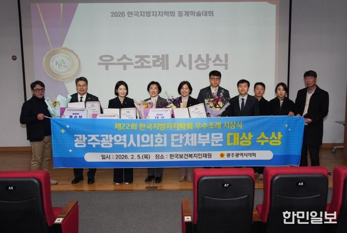 한민일보 서울포커스 임경복 기자 | 광주광역시의회는 5일 청주시 한국보건복지인재원에서 열린 제22회 한국지방자치학회 주관 우수조례 시상식에서 단체 부문 대상을 비롯해 개인·공무원 부문에서도 우수상 등을 수상했다.
