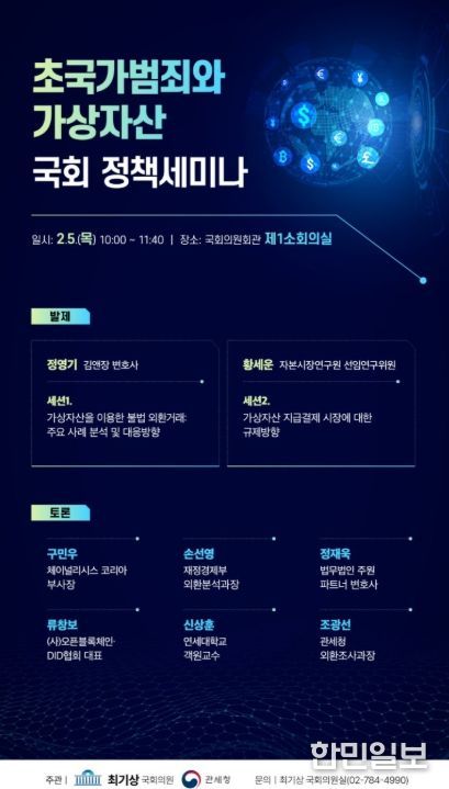한민일보 서울포커스 임철현 기자 | 관세청은 최기상 국회의원(더불어민주당·서울 금천구)과 공동으로 2월 5일 국회 의원회관에서 '초국가범죄와 가상자산: 국경을 넘어선 불법 자금 흐름 대응' 국회 정책 세미나를 개최했다.
