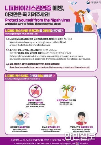 니파바이러스 감염증은 감염된 과일박쥐나 돼지 등 동물과 접촉, 오염된 식품(대추야자 수액 등) 섭취로 감염될 수 있으며, 환자의 체액과 밀접 접촉 시 사람 간 전파도 가능한 것으로 알려졌다.