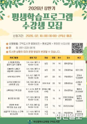 한민일보 서울포커스 임광현 기자 | 부산광역시립구덕도서관은 3월부터 5월까지 유아와 성인 140여 명을 대상으로 구덕도서관에서 ‘2026년 상반기 평생학습 프로그램’을 운영한다.