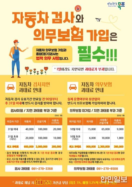 한민일보 서울포커스 임광현 기자 | 목포시가 자동차 검사 미이행과 의무보험 미가입으로 인한 과태료 부담을 사전에 예방하기 위해 집중 홍보에 나서고 있다.