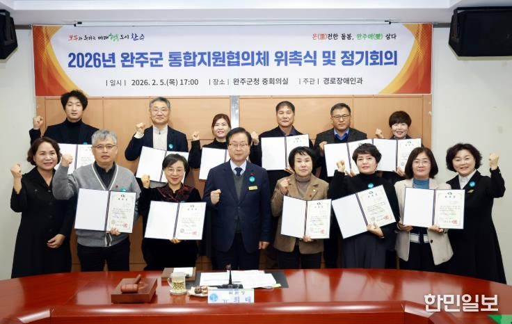 지난 5일 완주군은 군청 중회의실에서 ‘완주군 통합지원협의체’ 위촉식을 열고, 제1차 정기회의를 열어 ‘2026년 통합돌봄사업 실행계획(안)’을 심의·의결했다.